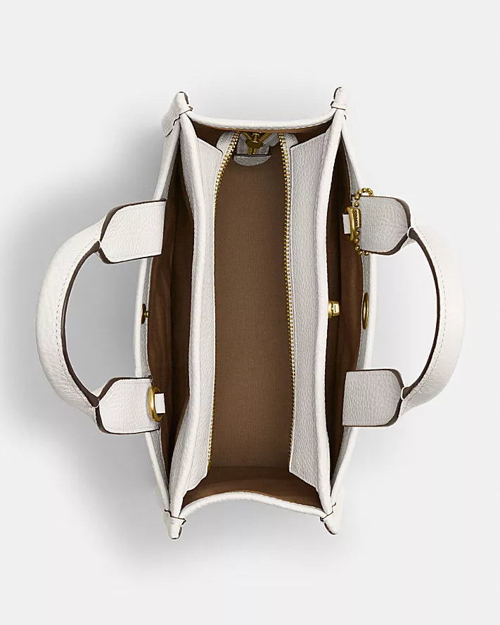 Pebble leatherZip-top closure, fabric liningHandles with 10cm dropOutside turnlock and snap pocketsDetachable strap with 61cm drop for shoulder or crossbody wearFits an iPad26cm (L) x 19.5cm (H) x 13cm (W)
